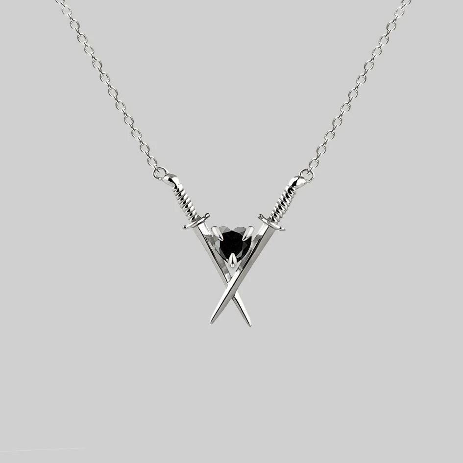 A pair of crossed swords protecting a central Black Onyx gemstone heart hang from a delicate chain necklace.
