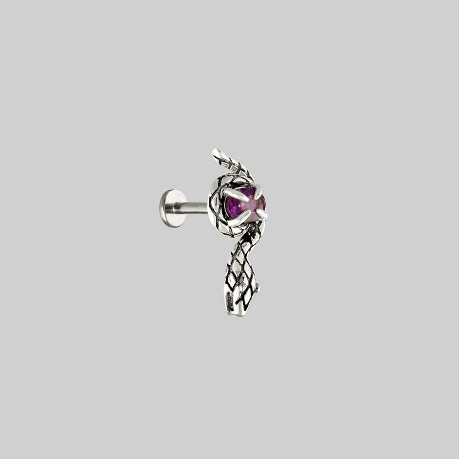 Deadly coiled snake stud featuring a vibrant Amethyst gemstone set within claw shaped prongs.