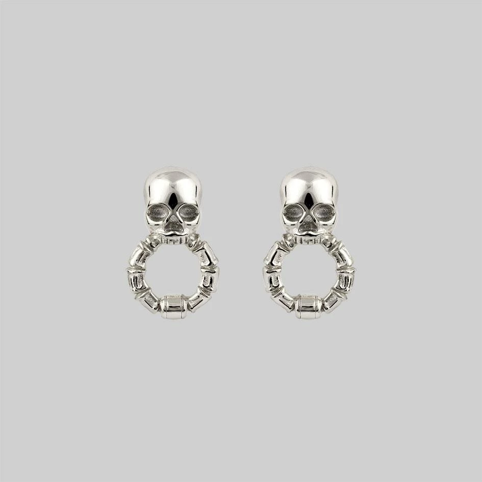 Scary or Cute? We can’t decide! Detailed Silver skull & bone door knocker style stud earrings.