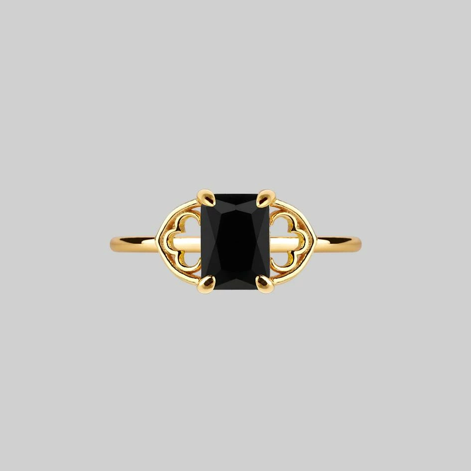 An elegant gothic style ring featuring tracery Cathedral detail shoulders either side of a Black Onyx rectangle cut gemstone.