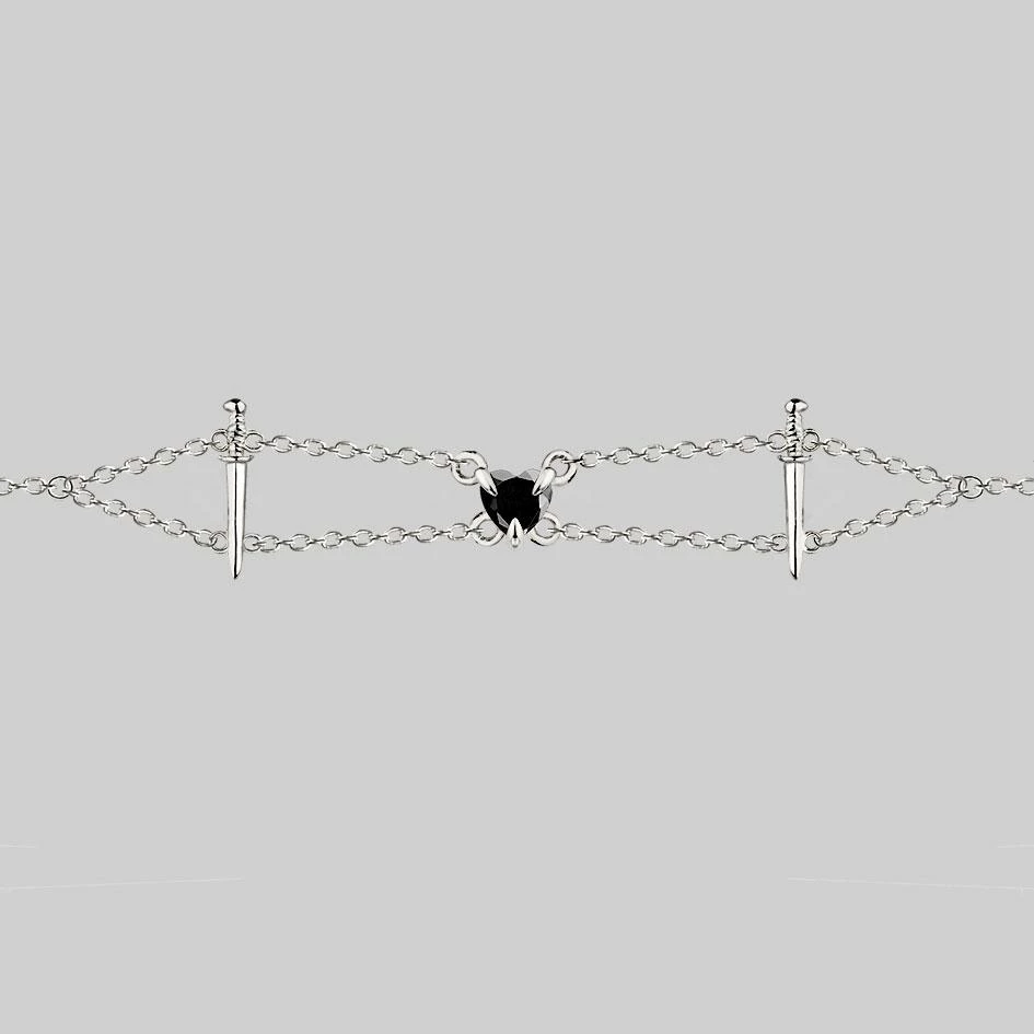 Delicate silver chain choker featuring a central Black Onyx Heart defended by two swords.