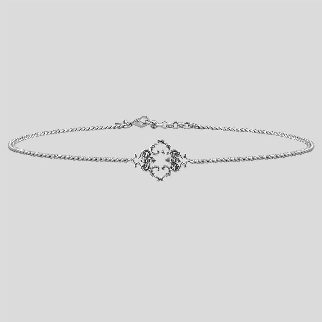 Delicate silver chain choker featuring a detailed floral centre.