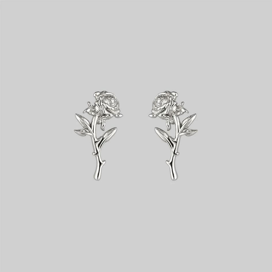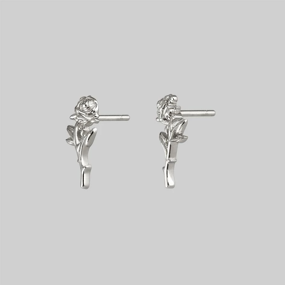 Intricate rose stem with leaf detail silver earrings.