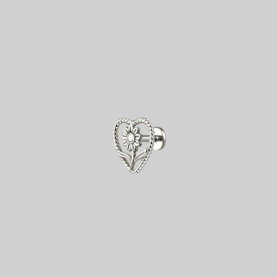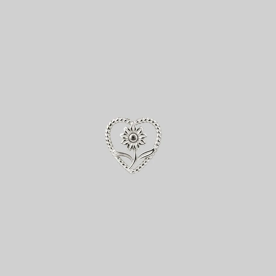 Heart framed sunflower ear stud with delicate twisted edge detail.