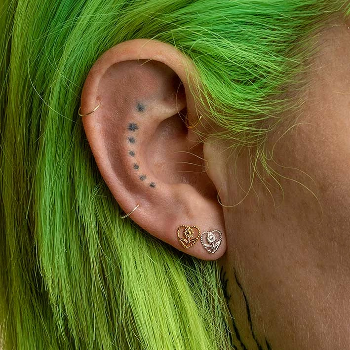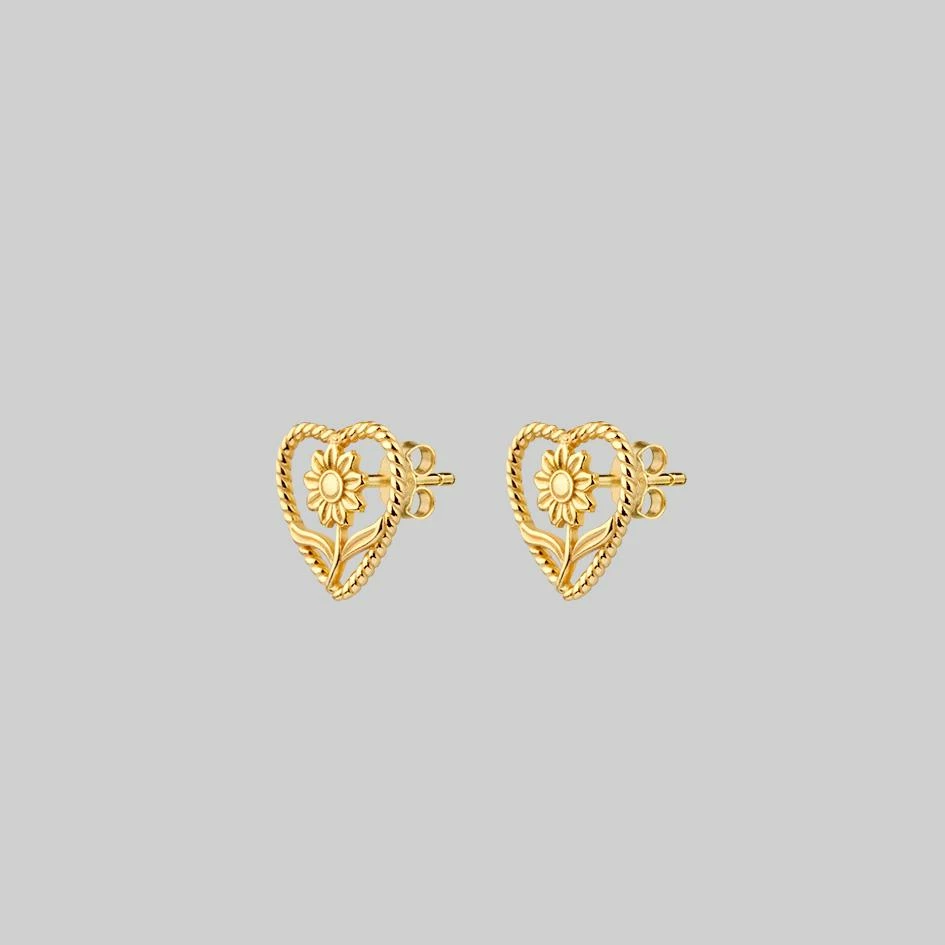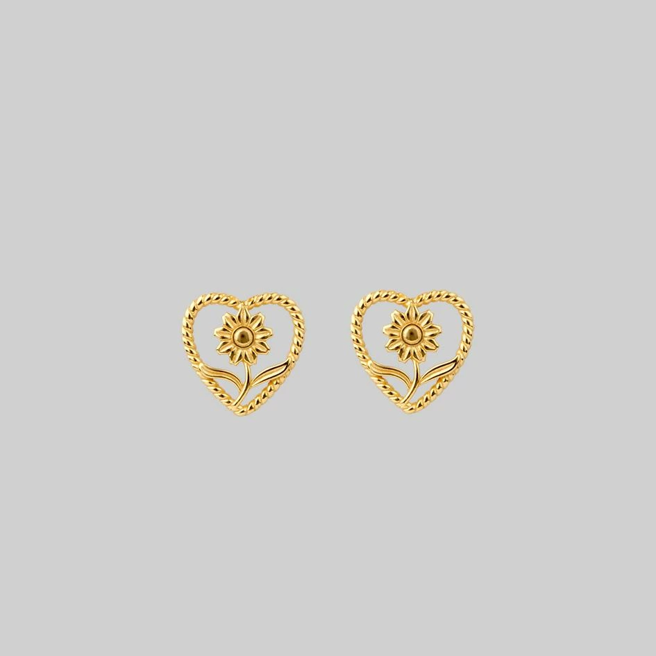 Heart framed sunflower earrings with delicate twisted edge detail.