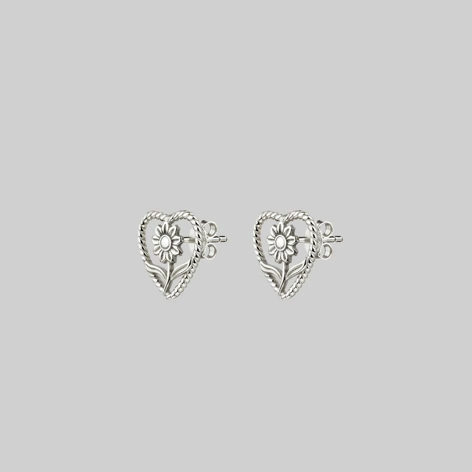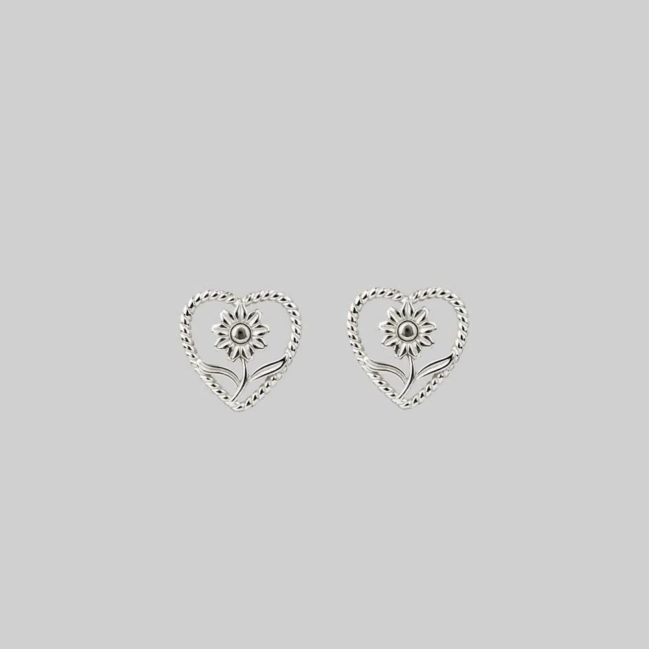 Silver heart framed sunflower earrings with delicate twisted edge detail.