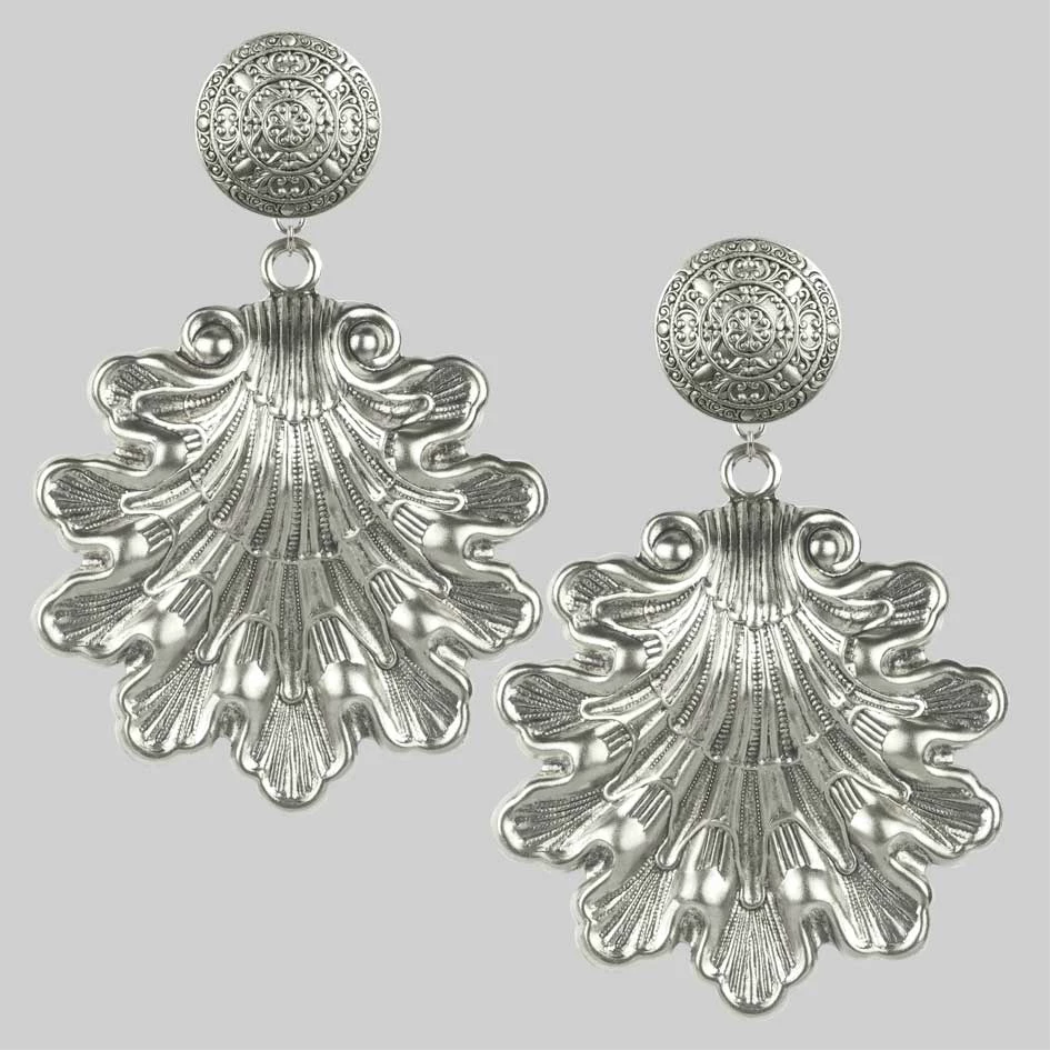 Huge oversized ornate clam shell earrings.