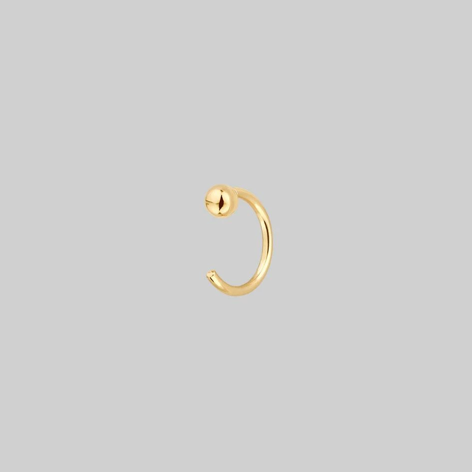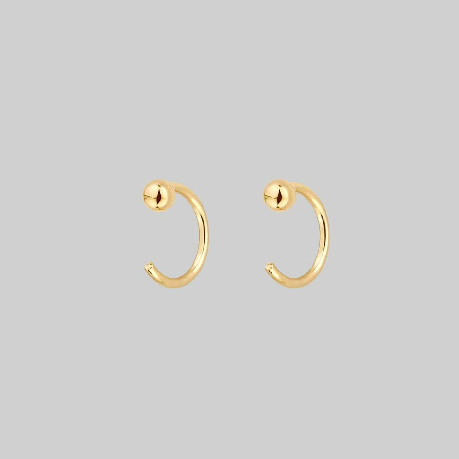 Simple gold ball huggie hoop earrings. Simply pull the open hoop through your piercing to the end. Slightly adjustable.