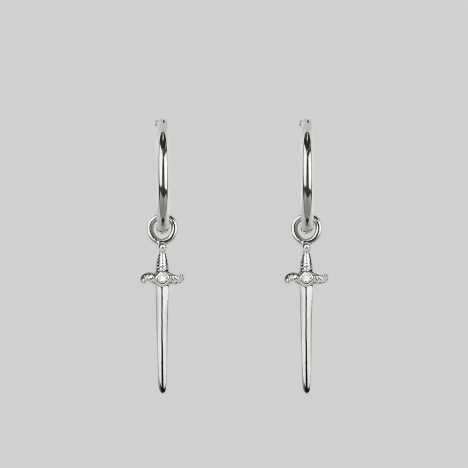 Deathly dagger hoop earrings featuring tiny Cubic Zirconia crystal centres.
