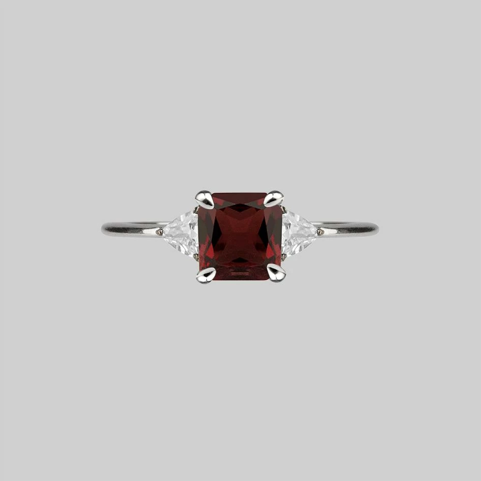 An elegant & classic vintage style ring featuring a stunning square-cut Garnet gemstone with two triangle Cubic Zirconia crystals.