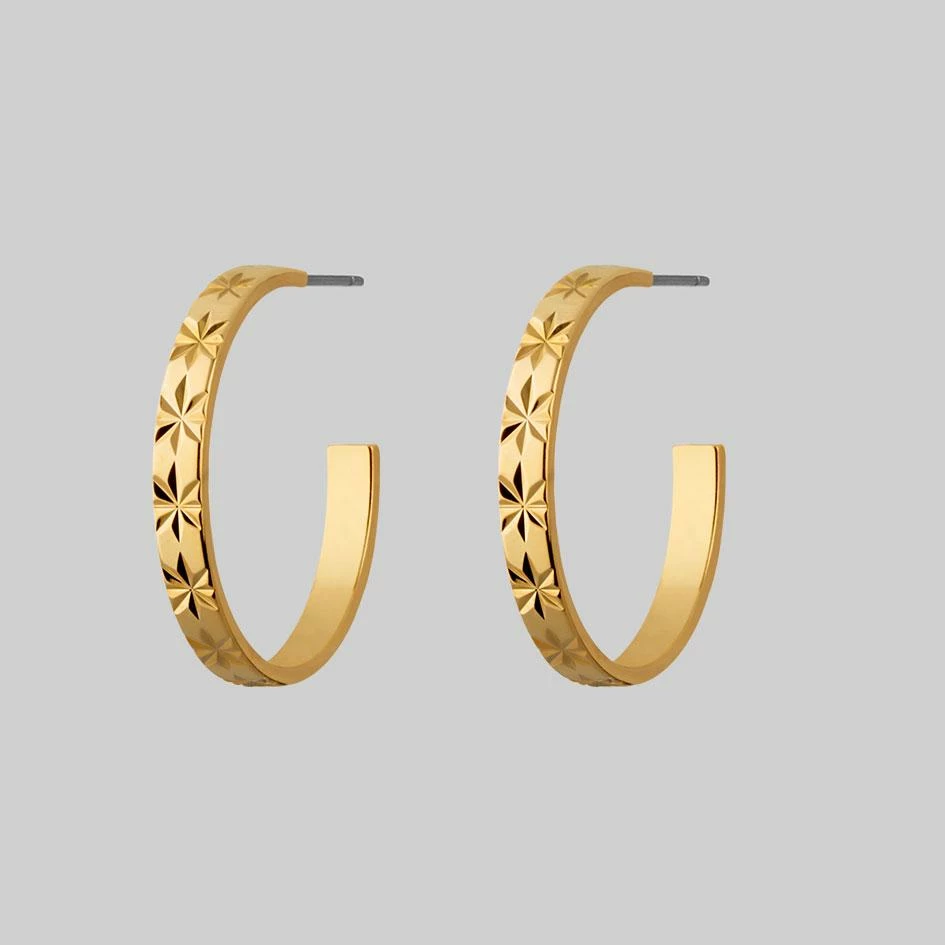 Gold hoop earrings featuring a delicate etched starburst pattern.
