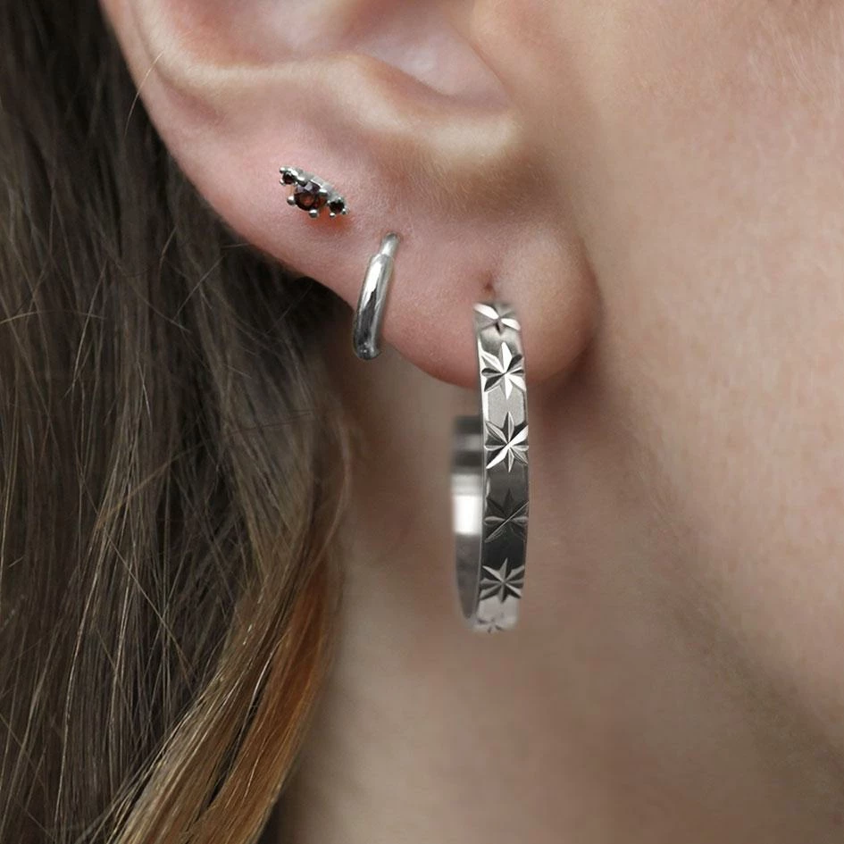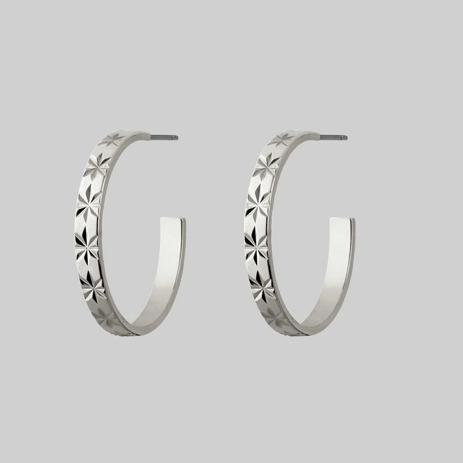 Silver hoop earrings featuring a delicate etched starburst pattern.