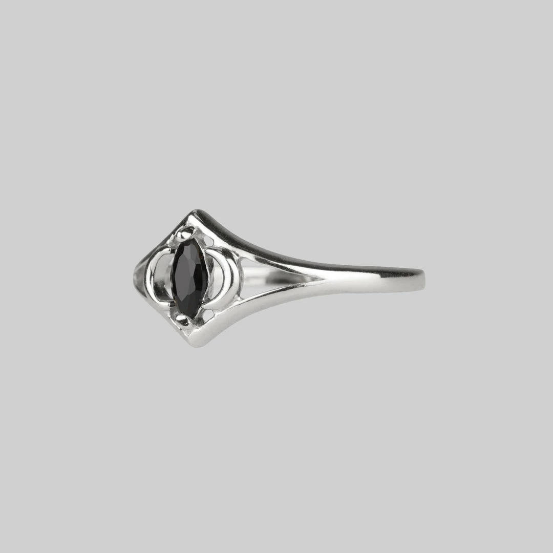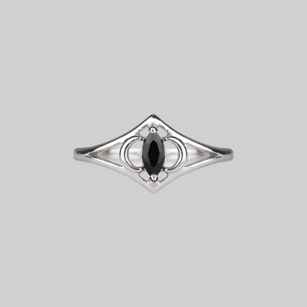 Inspired by the night’s celestial paths, two moon crescents sit either side of a Black Spinel gemstone within this symmetrical design.
