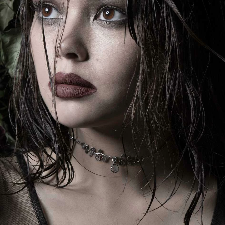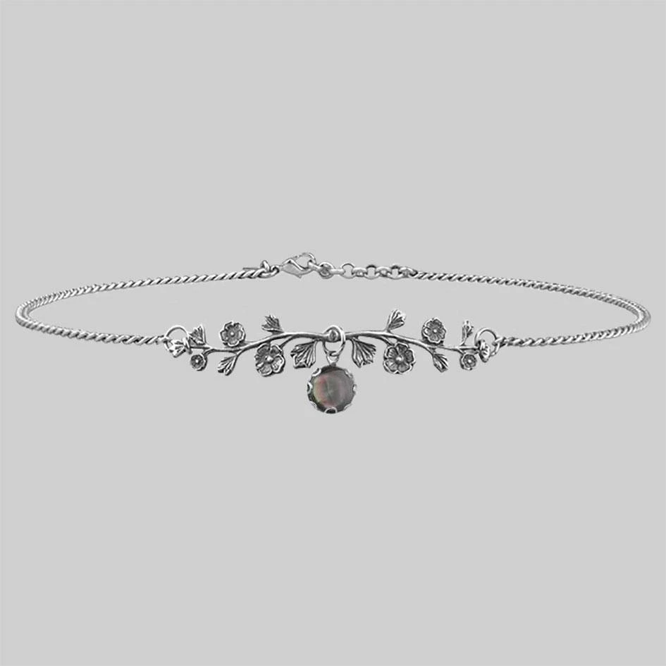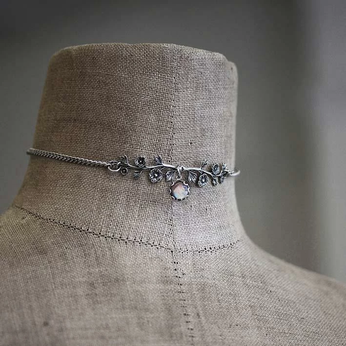 Silver chain choker featuring wild rose detailing and an iridescent Black Mother of Pearl centre.