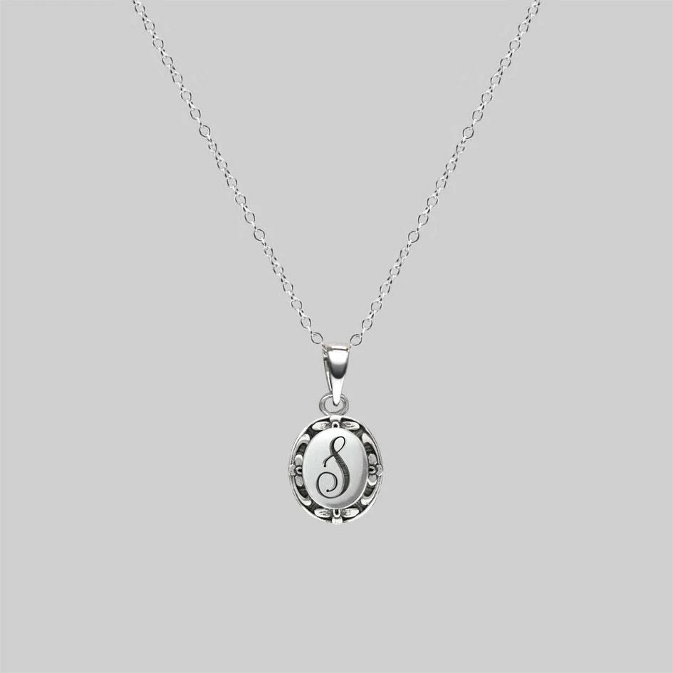Silver medallion necklace featuring a delicate script initial with ornate frame.