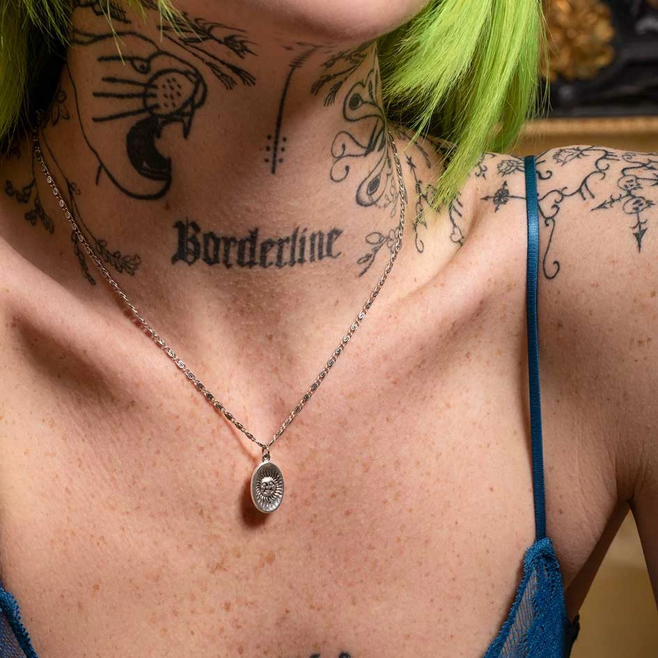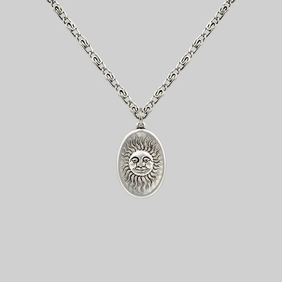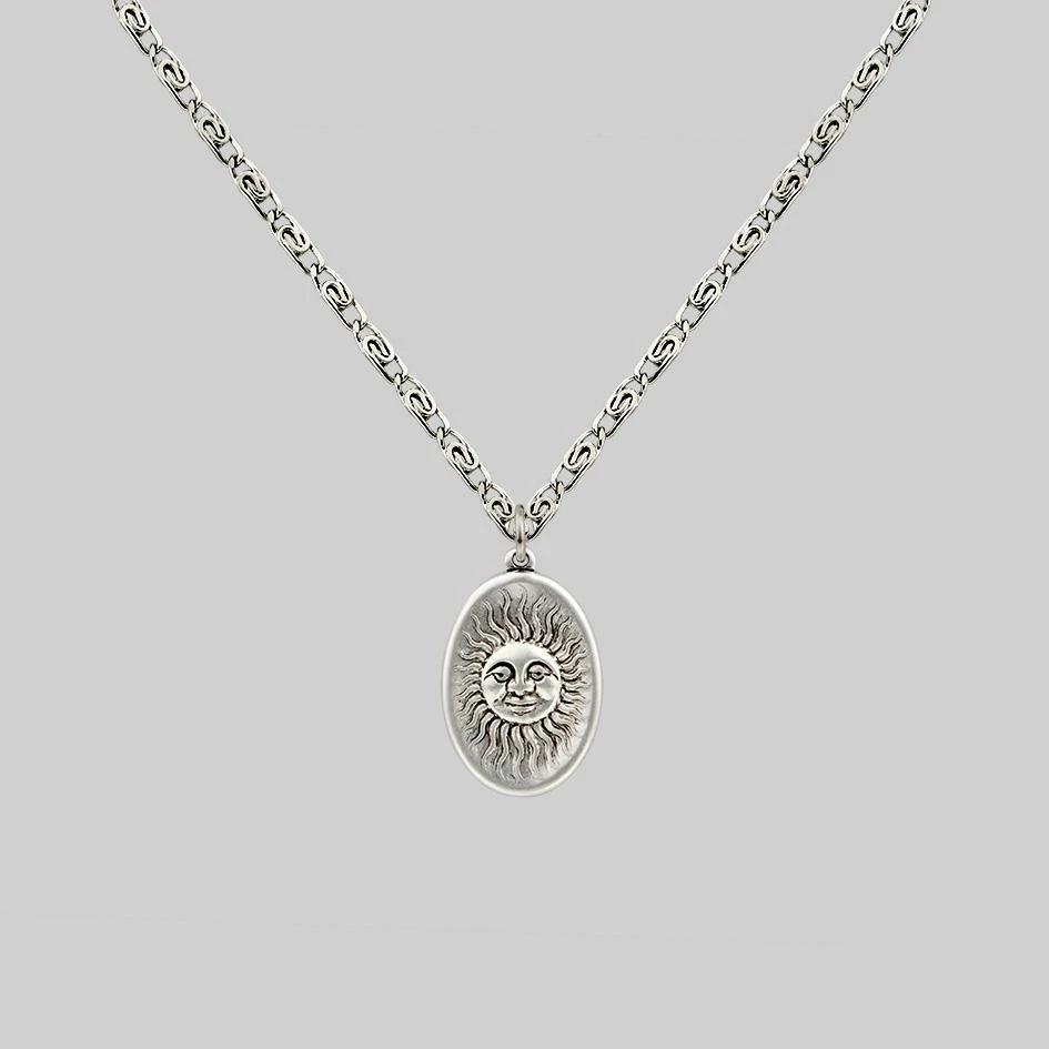 Oval celestial sun medallion with sweet little face detail hangs from a decorative snail chain.