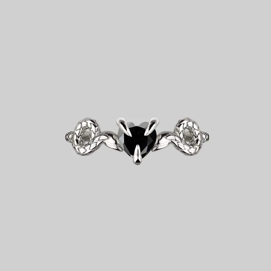 Deadly intertwined double headed Serpent ring band. Featuring a central Onyx gemstone heart set within claw shaped prongs.
