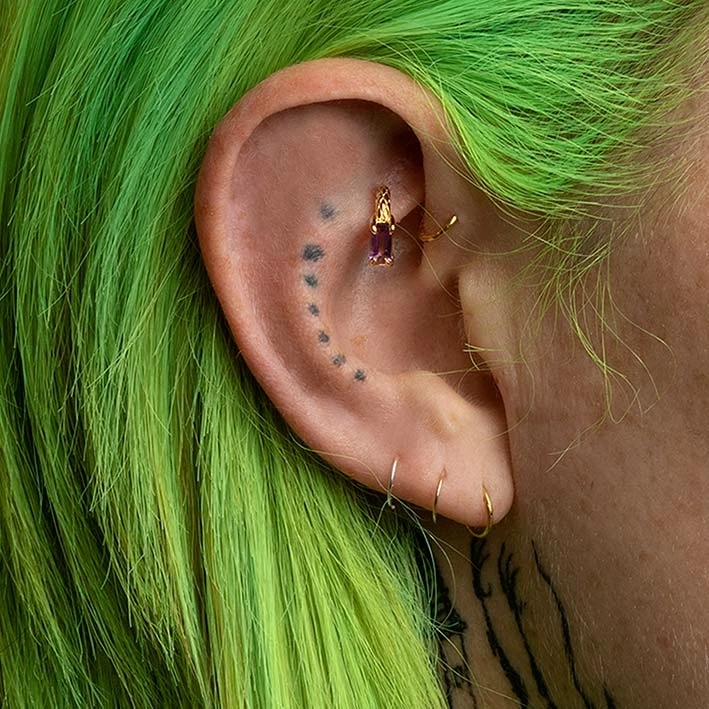 Can be worn in a fordward helix, helix, rook, daith, tragus, snug or anti-tragus piercing.
