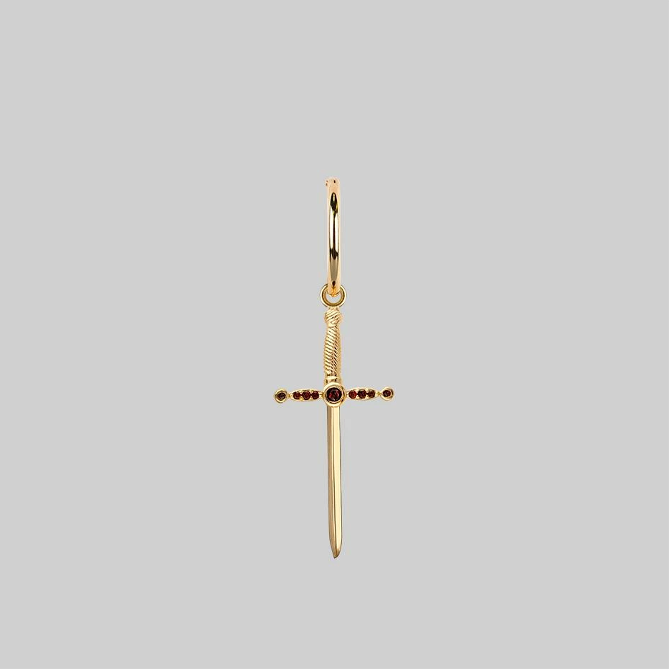 Deathly dagger hoop earrings encrusted with Garnet gemstones.