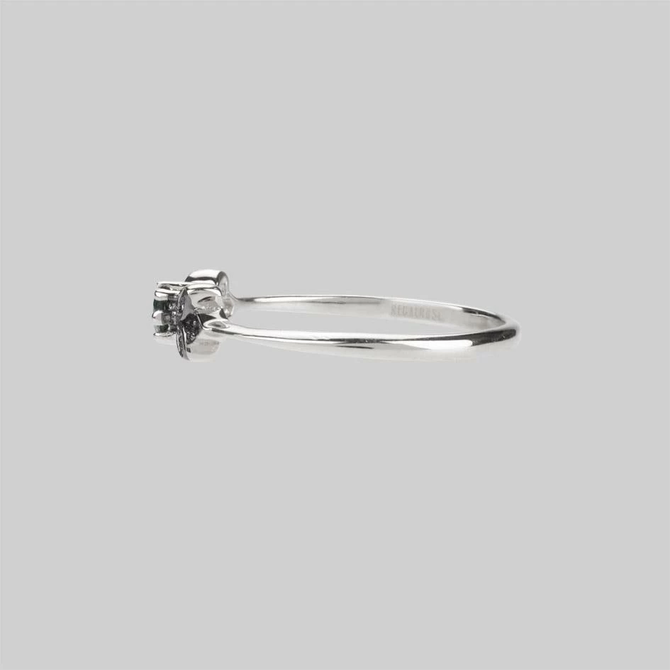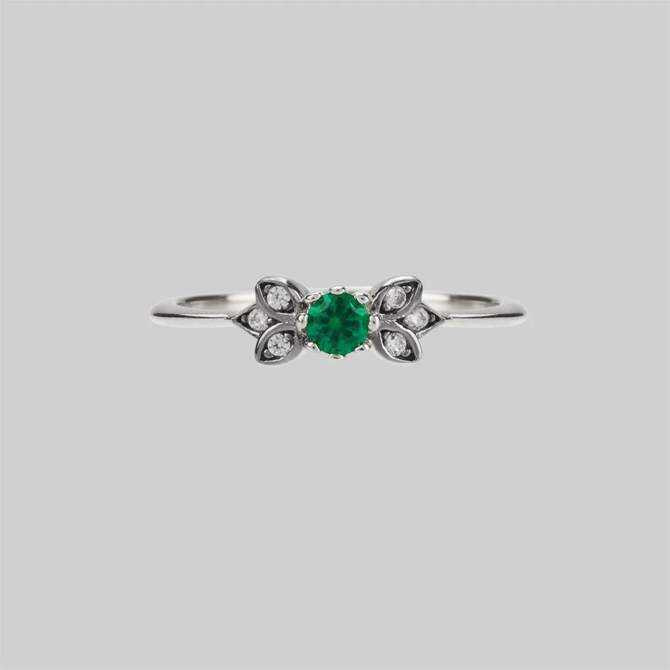 Vintage style leaf detailed ring featuring a vibrant Green Quartz center with tiny Cubic Zirconia crystals. A dainty, elegant & detailed classic design.