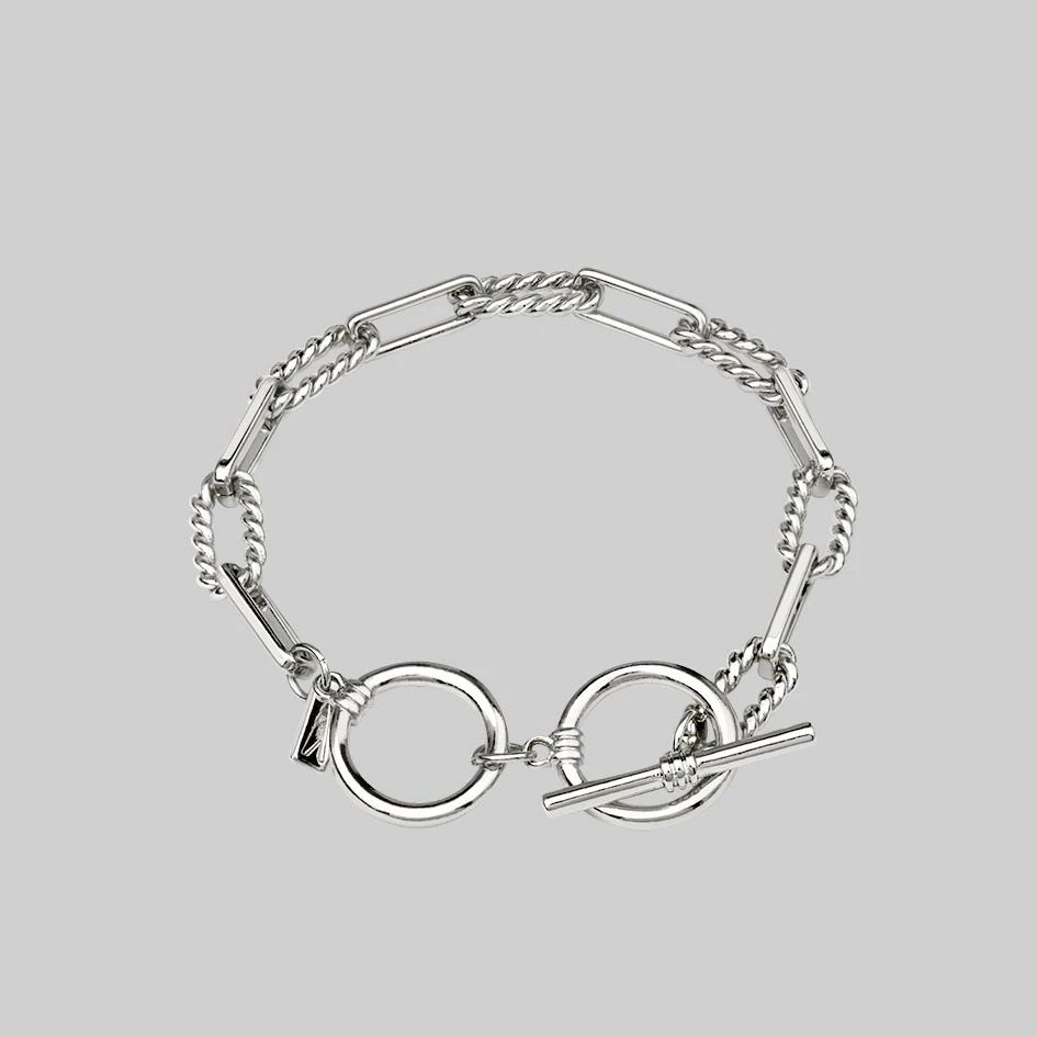 Silver twisted link chain bracelet with T-Bar clasp.