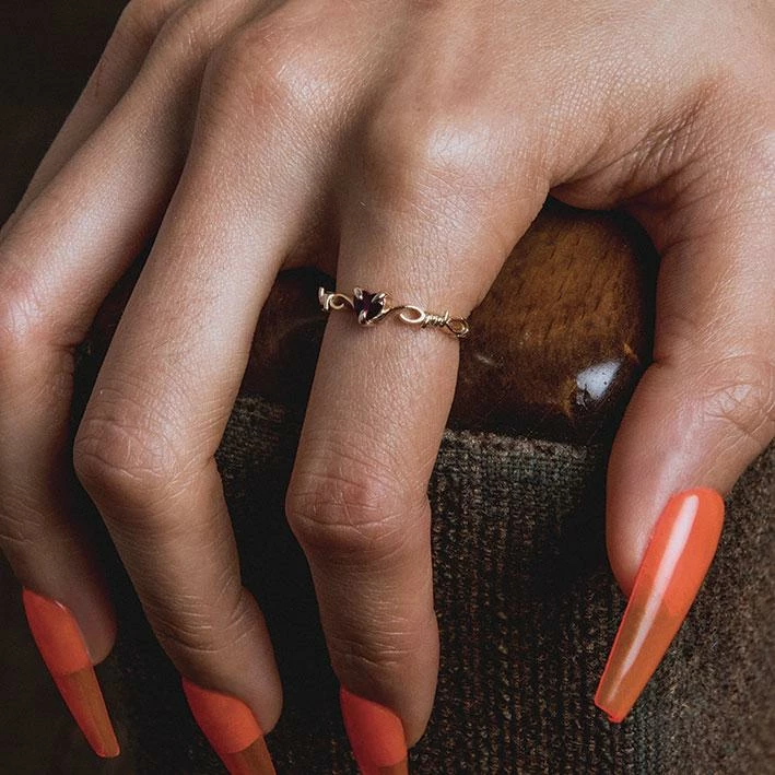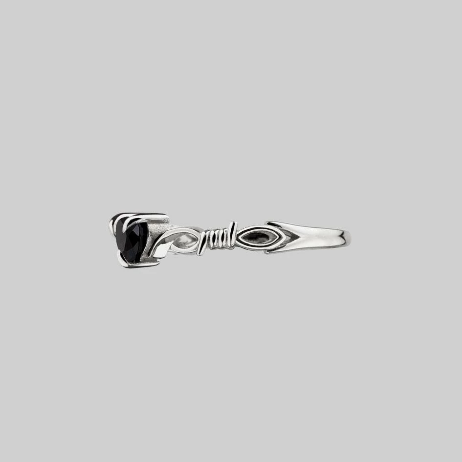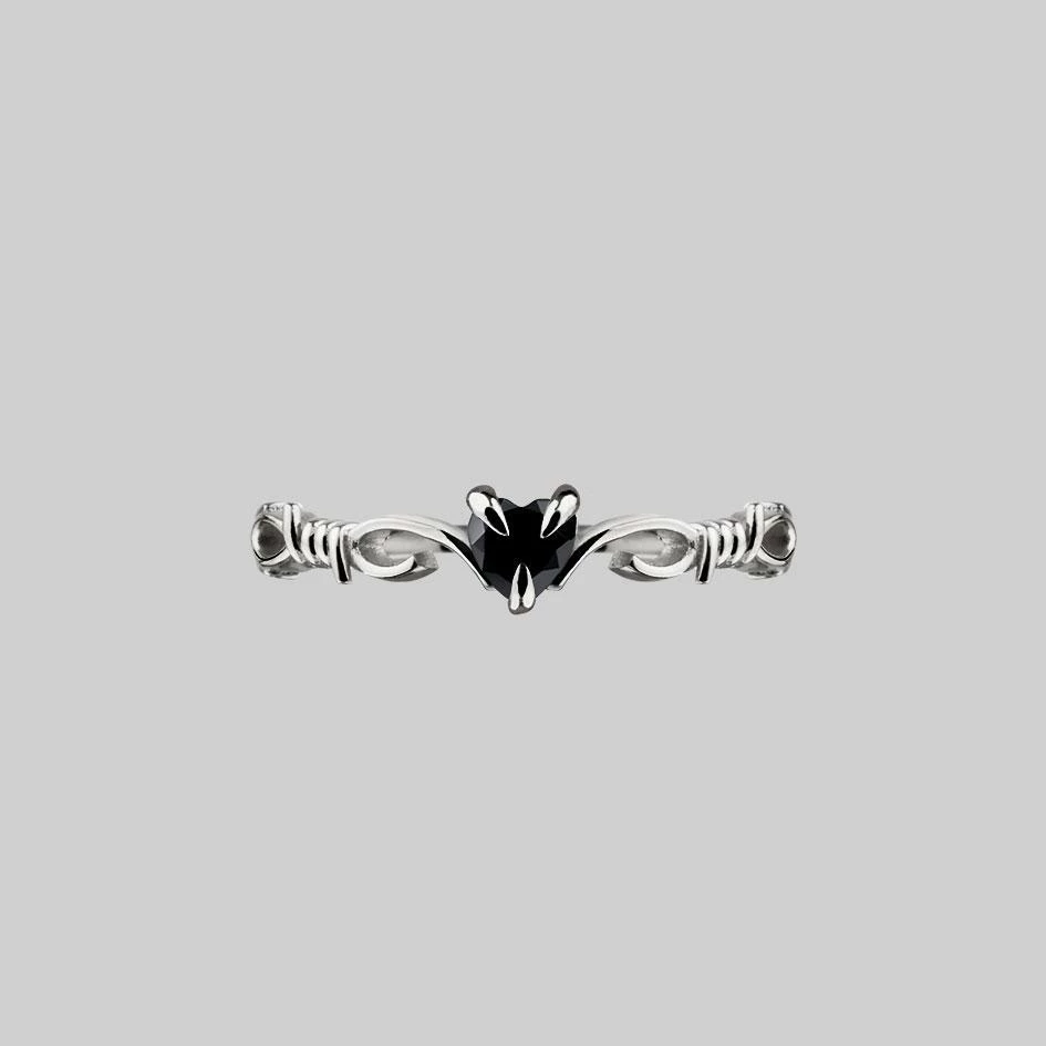 Elegant and deadly. Silver barbed wire ring with a central Black Spinel gemstone heart set within claw shaped prongs.