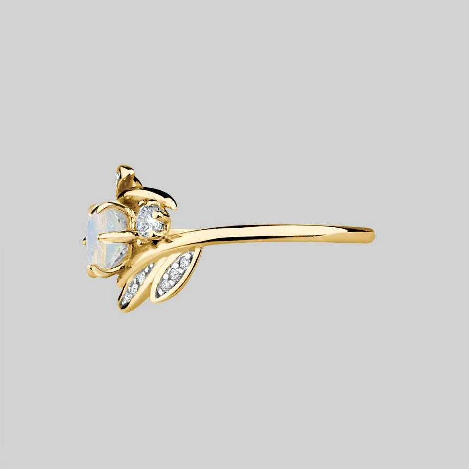 Inspired by eras past, this delicate yet stand-out design features a stunning cut Opal surrounded by luscious leaf detail encrusted with sparkling Cubic Zirconia.