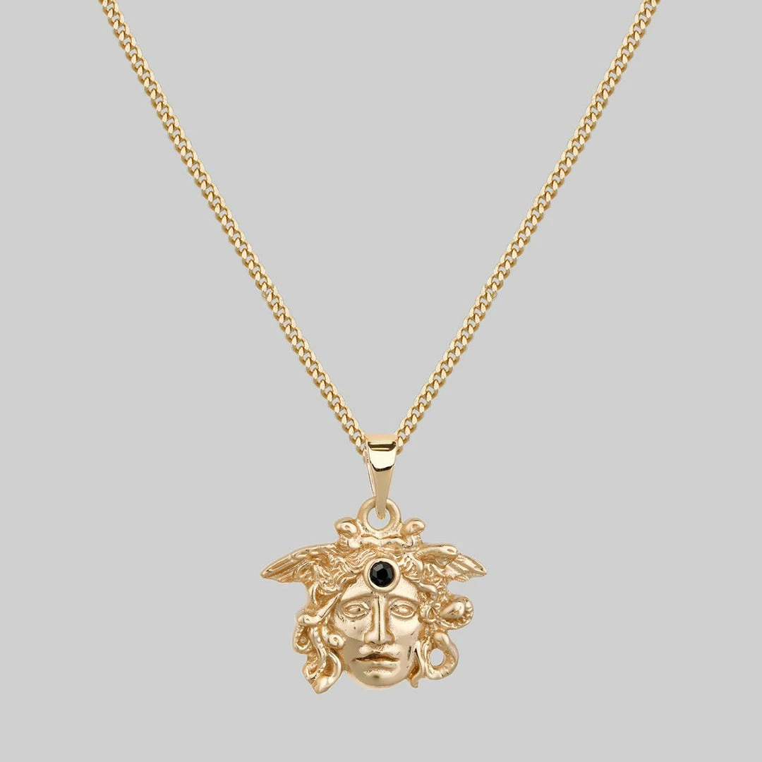 Gold Medusa pendant necklace. Intricate detail featuring a tiny Black Spinel faceted gemstone.Â