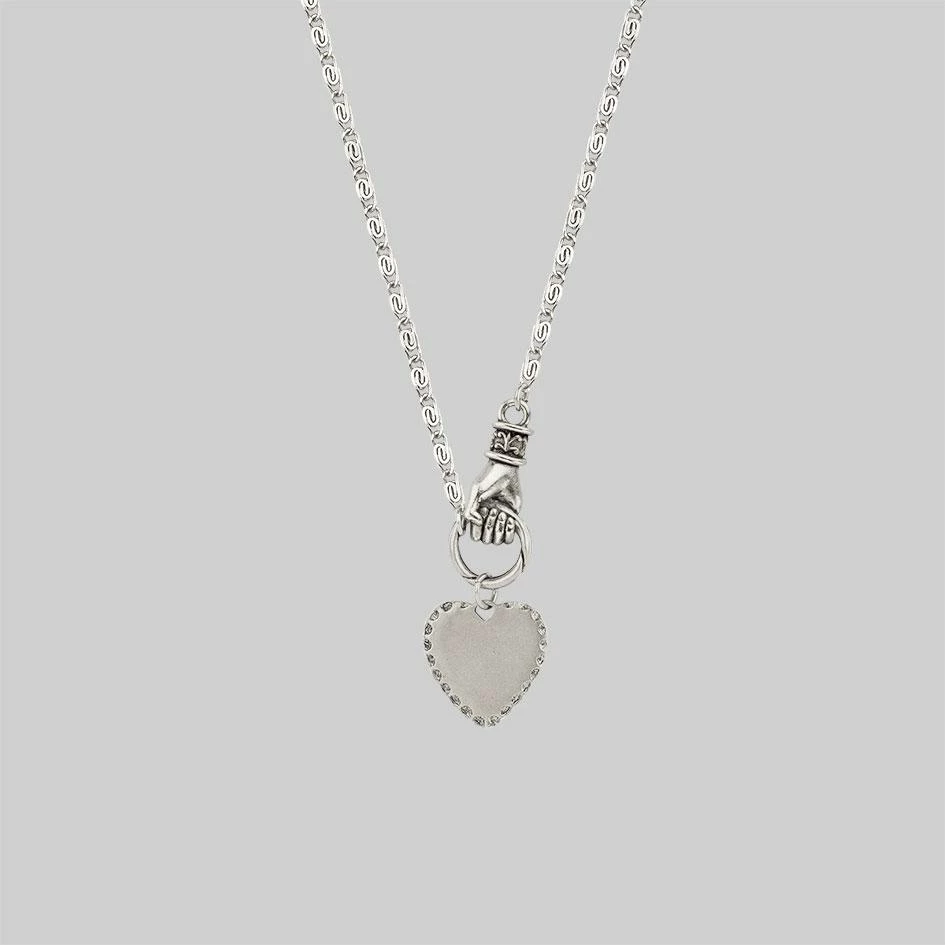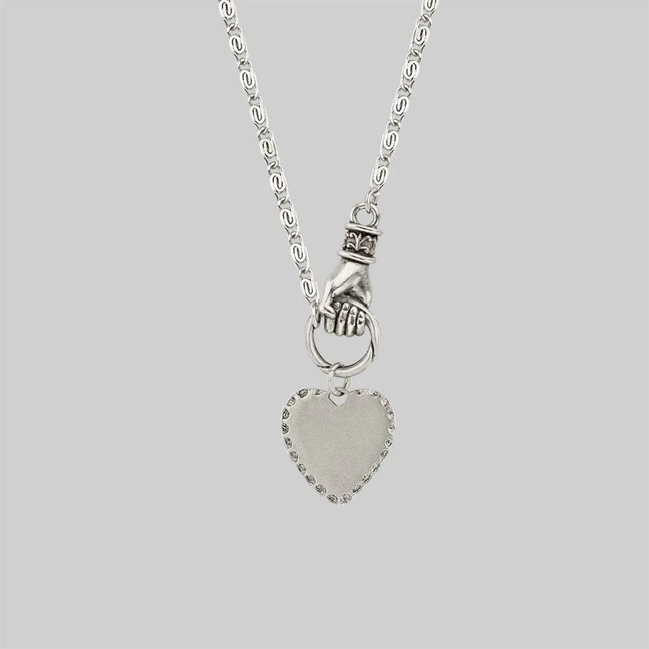 Layering necklace featuring a hand grasping heart pendant.