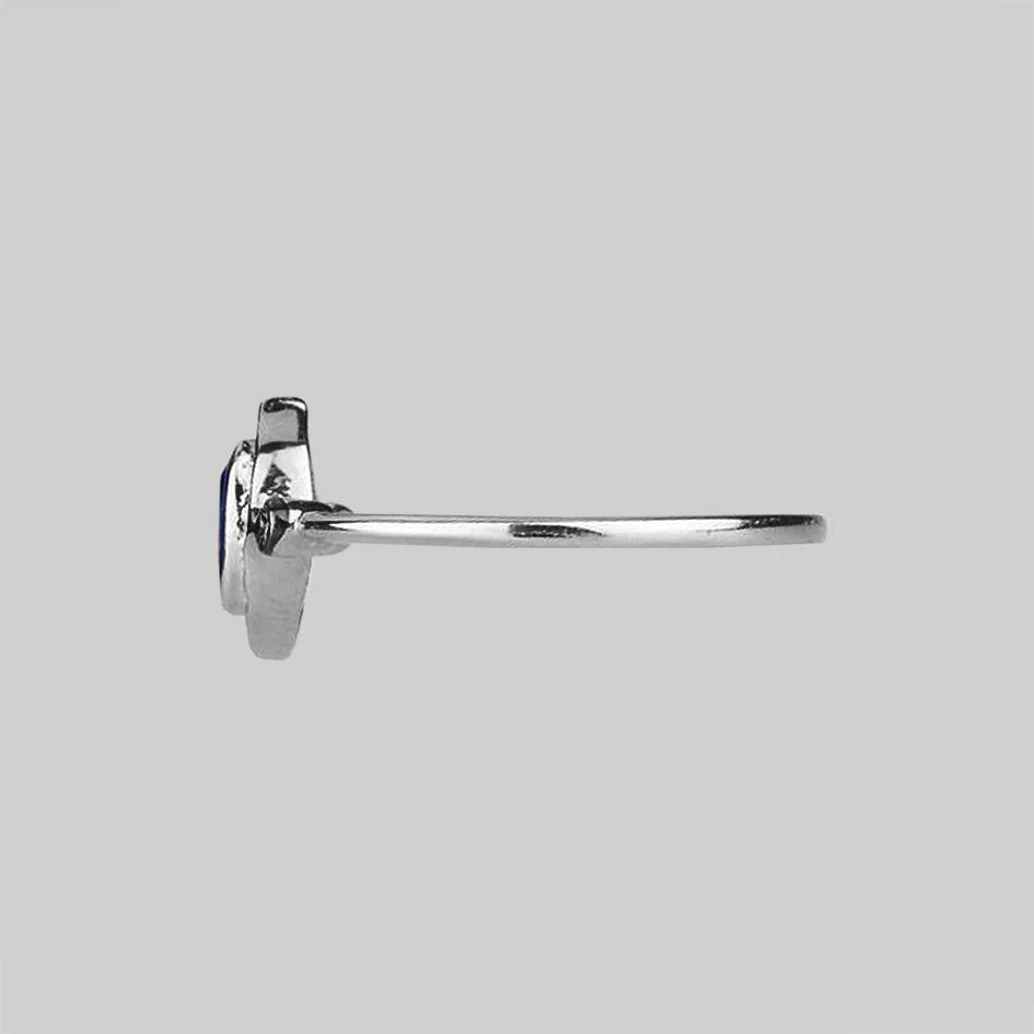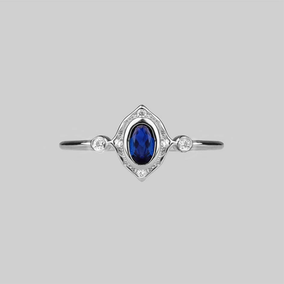 Romantic fine detail and tiny Cubic Zirconia crystals surround a bezel set Royal Blue Quartz in this vintage style ring.
