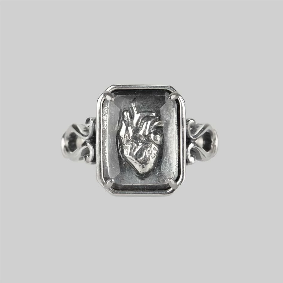 3D Anatomical heart under glass (Crystal CZ) ring featuring scroll detailed shoulders. Delicately detailed heart anatomy lies framed under faceted glass.
