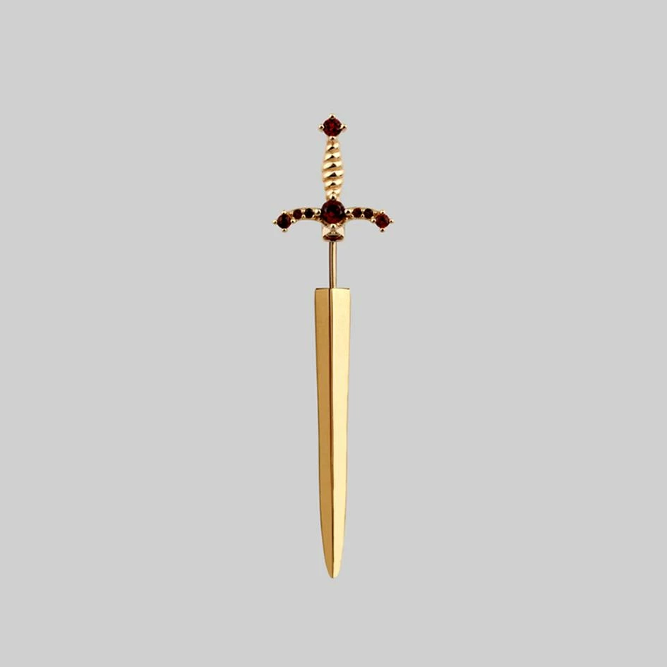 Regal dagger illusion earring encrusted with Garnet gemstone. For standard piercings.