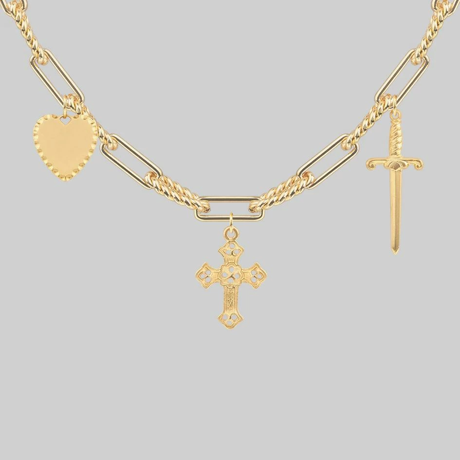 The ultimate Regalrose multi cham necklace featuring a deadly dagger, scalloped edge heart and a detailed gothic cross. Hangs from a twisted long link chain.