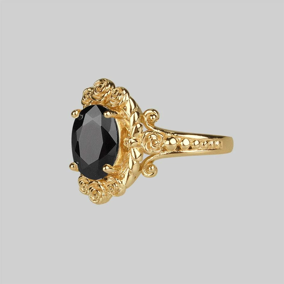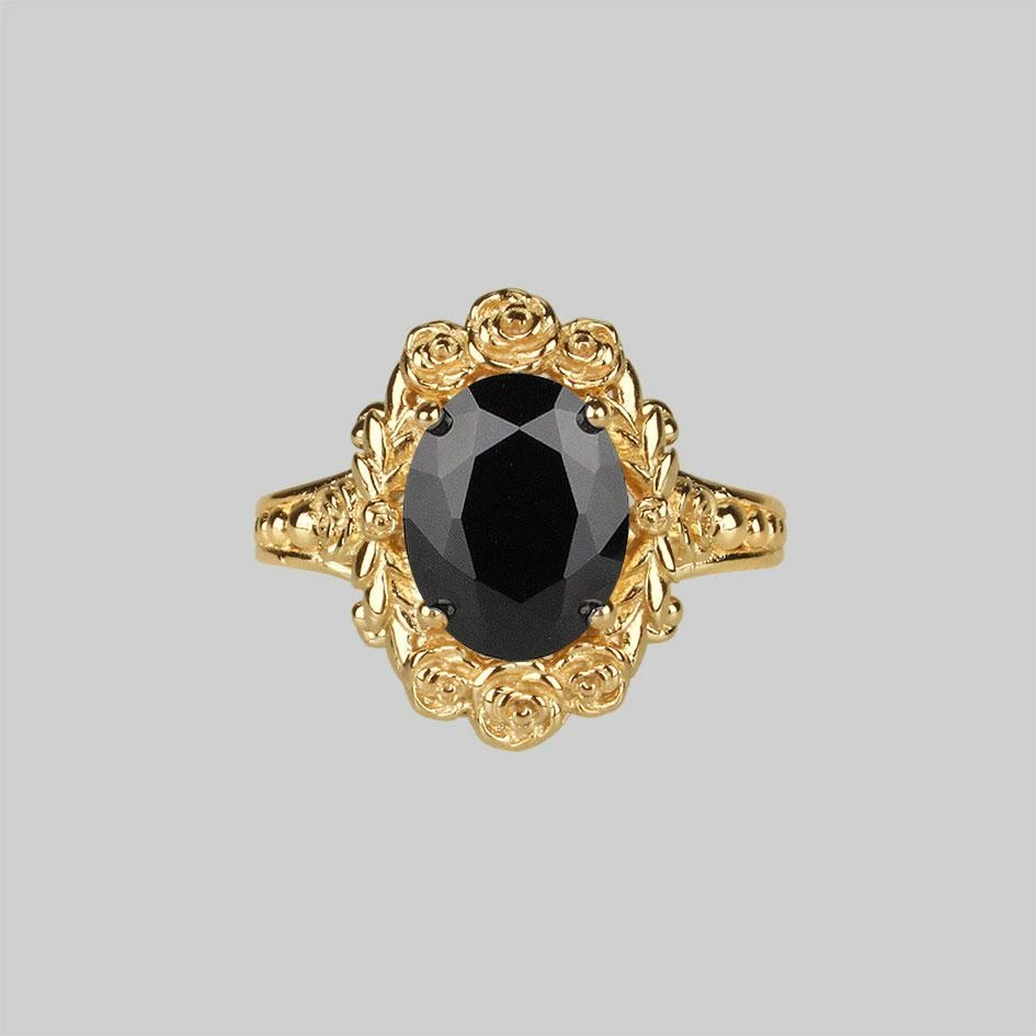 Luxurious vintage inspired cocktail ring featuring a large faceted Onyx gemstone set upon a ornately detailed split shank within a rose wreath frame.