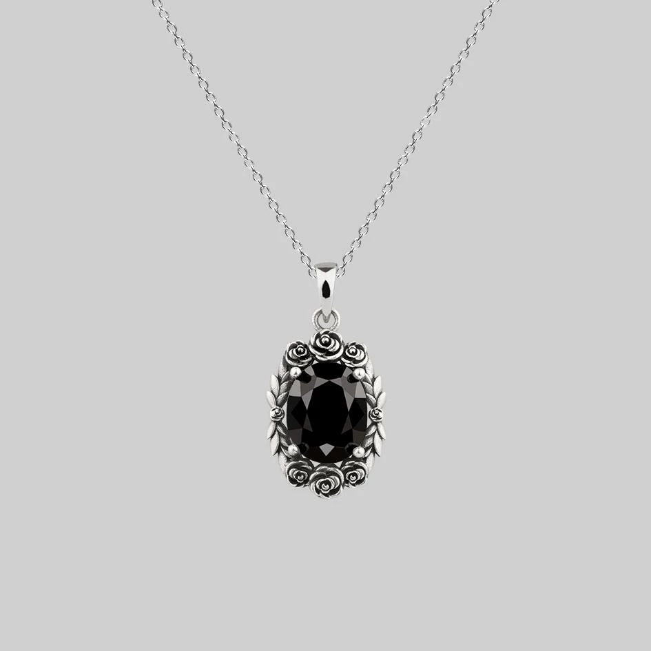 Luxurious vintage inspired necklace featuring a faceted Onyx gemstone set upon an ornately detailed shank within a rose wreath frame.