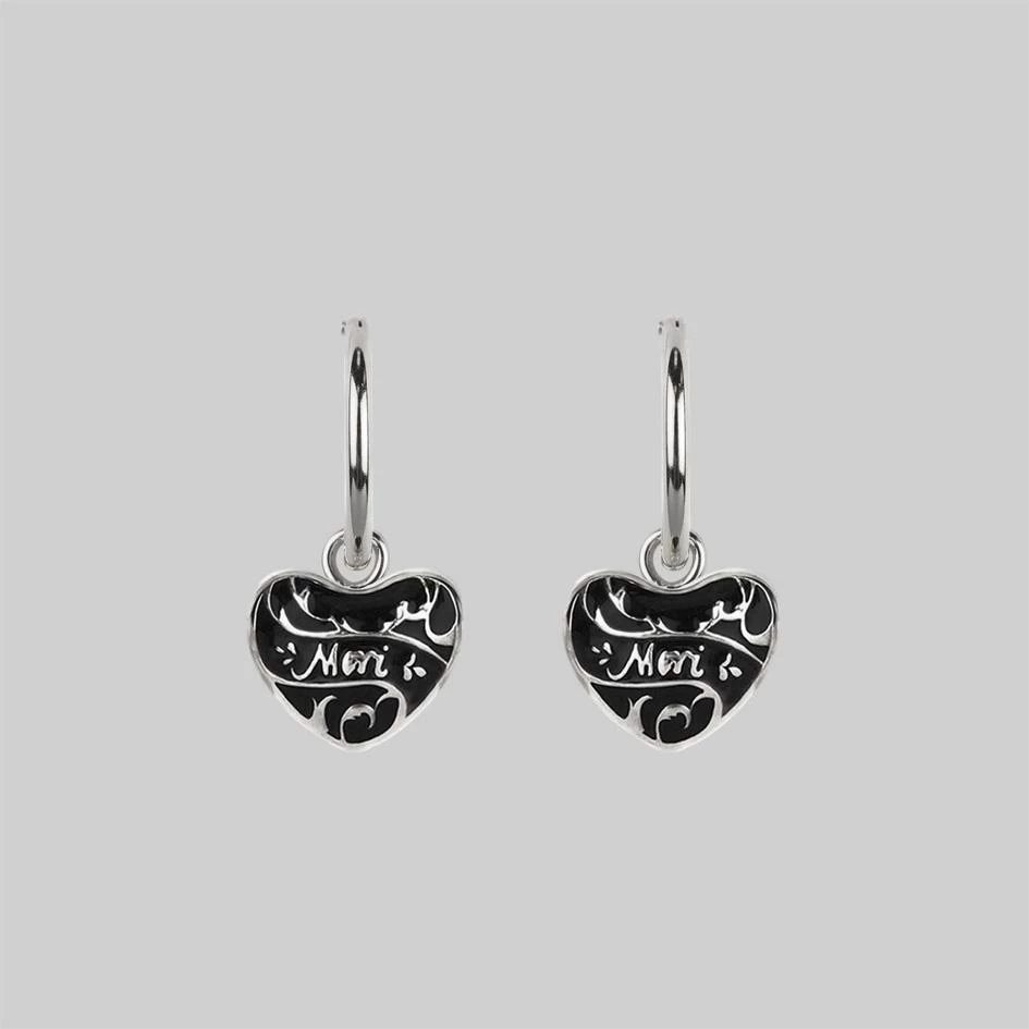 Deadly sweet black enamel hearts displaying the word ‘Mori’ in tiny script font. Inspired by the medieval practise of reflection on morality – ‘Memento Mori’ is a reminder to live and in Latin translates as “remember that you have to die”.