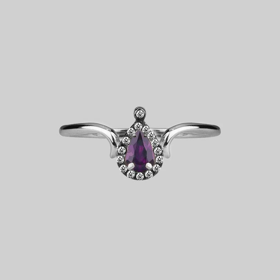 Vintage style elegant chevron ring featuring a tear drop cut Amethyst surrounded by tiny sparkling Cubic Zirconia crystal.