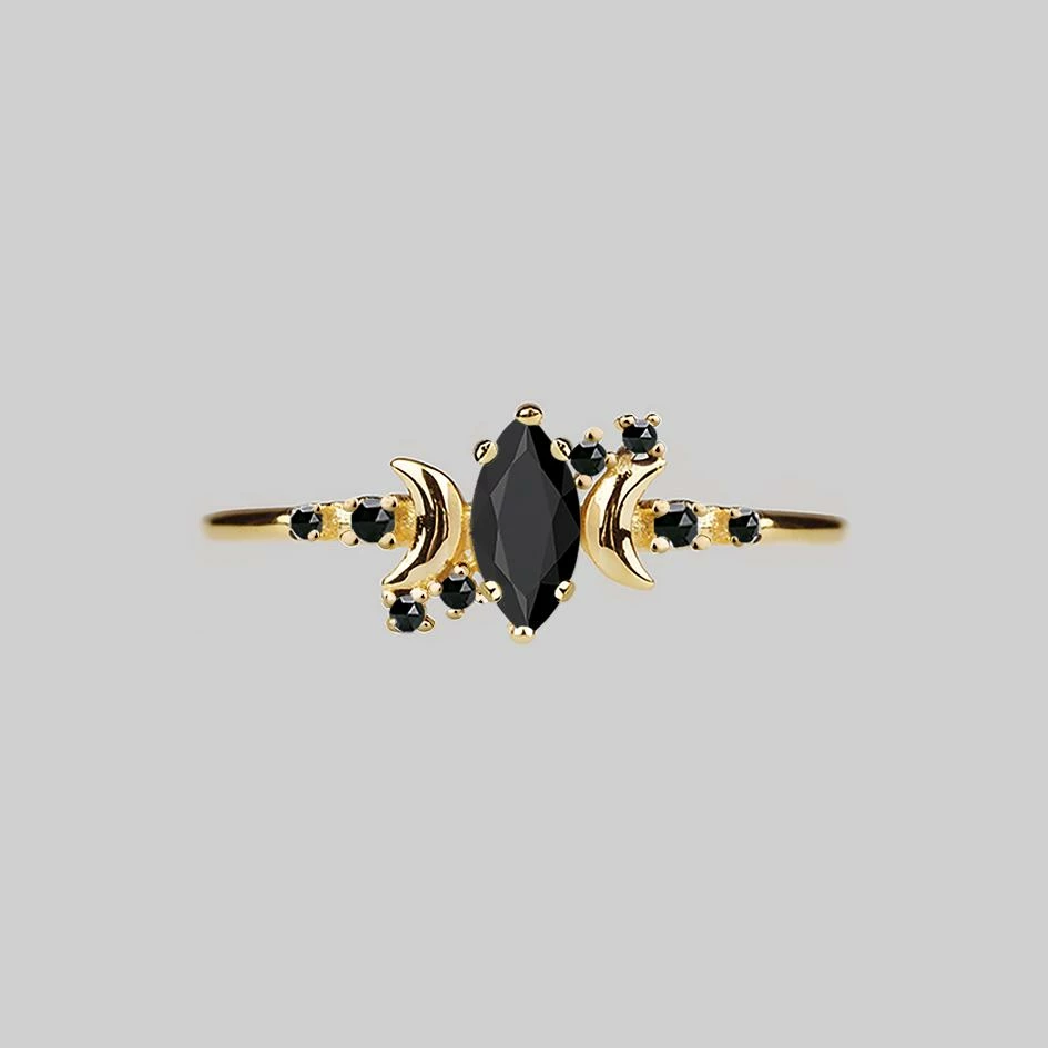 A magical twist on a classic cluster ring. A central Black Spinel gemstone with two little moon symbols and tiny Black Spinel stars complete this design.
