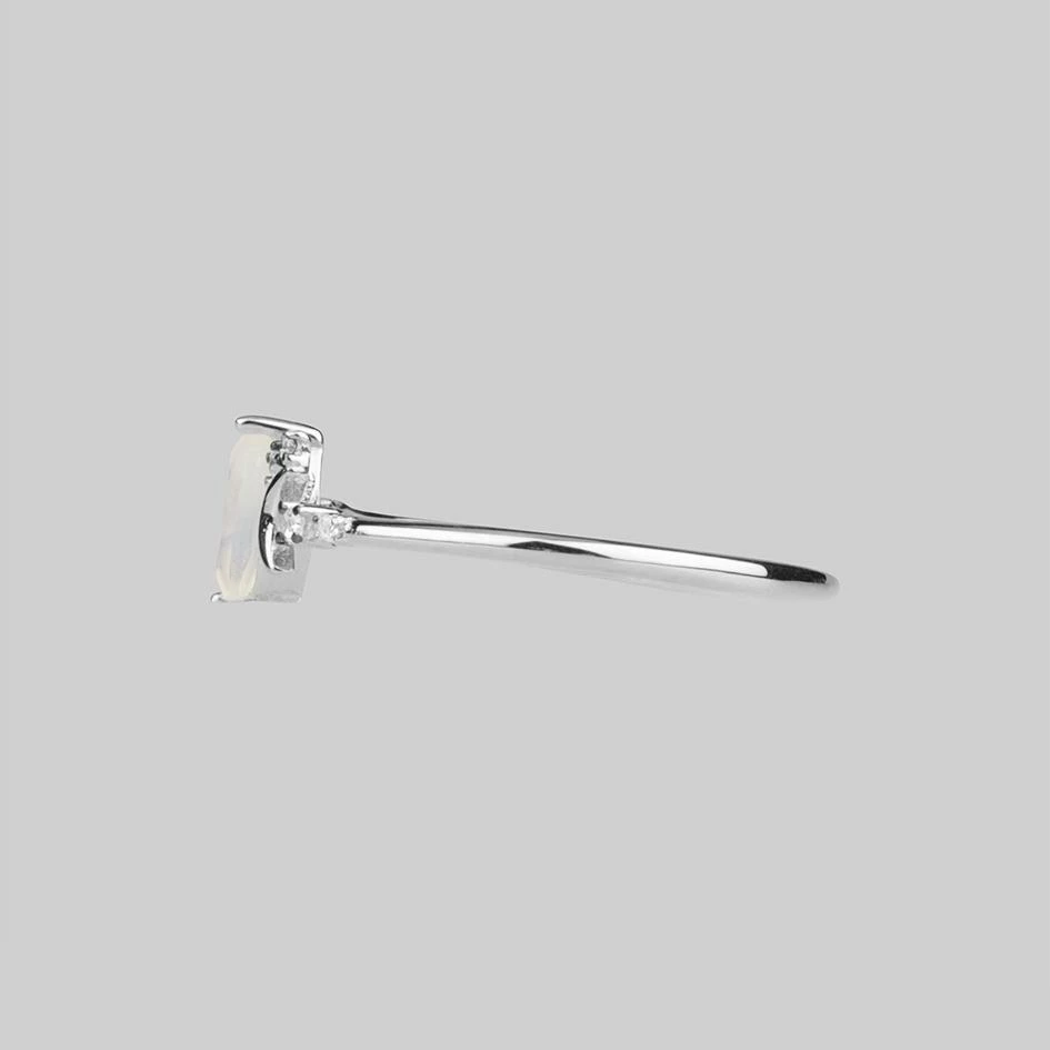 A magical twist on a classic cluster ring. Iridescent central Opal gemstone with moon symbols either side and Cubic Zirconia stars completing the design.