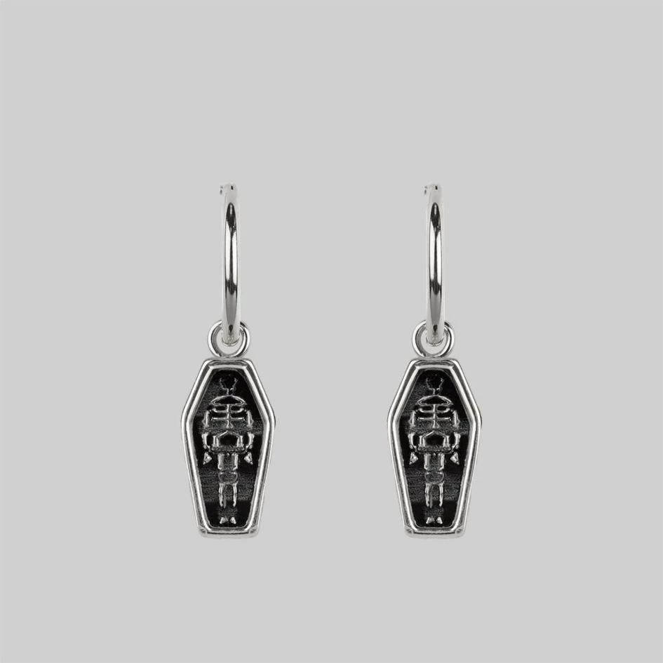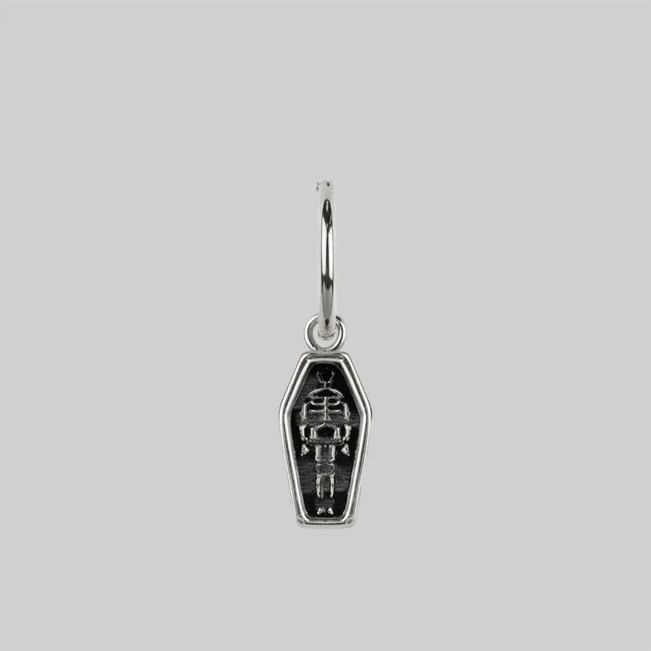 Delicate hoop earrings featuring tiny coffin charms encapsulating a delicate skeleton set behind enamel. Inspired by Mourning Jewellery worn to express the sentiment of death.