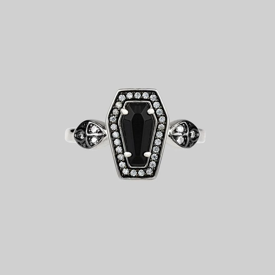 Deep black Onyx coffin shaped gemstone set within a frame of tiny Cubic Zirconia crystals.