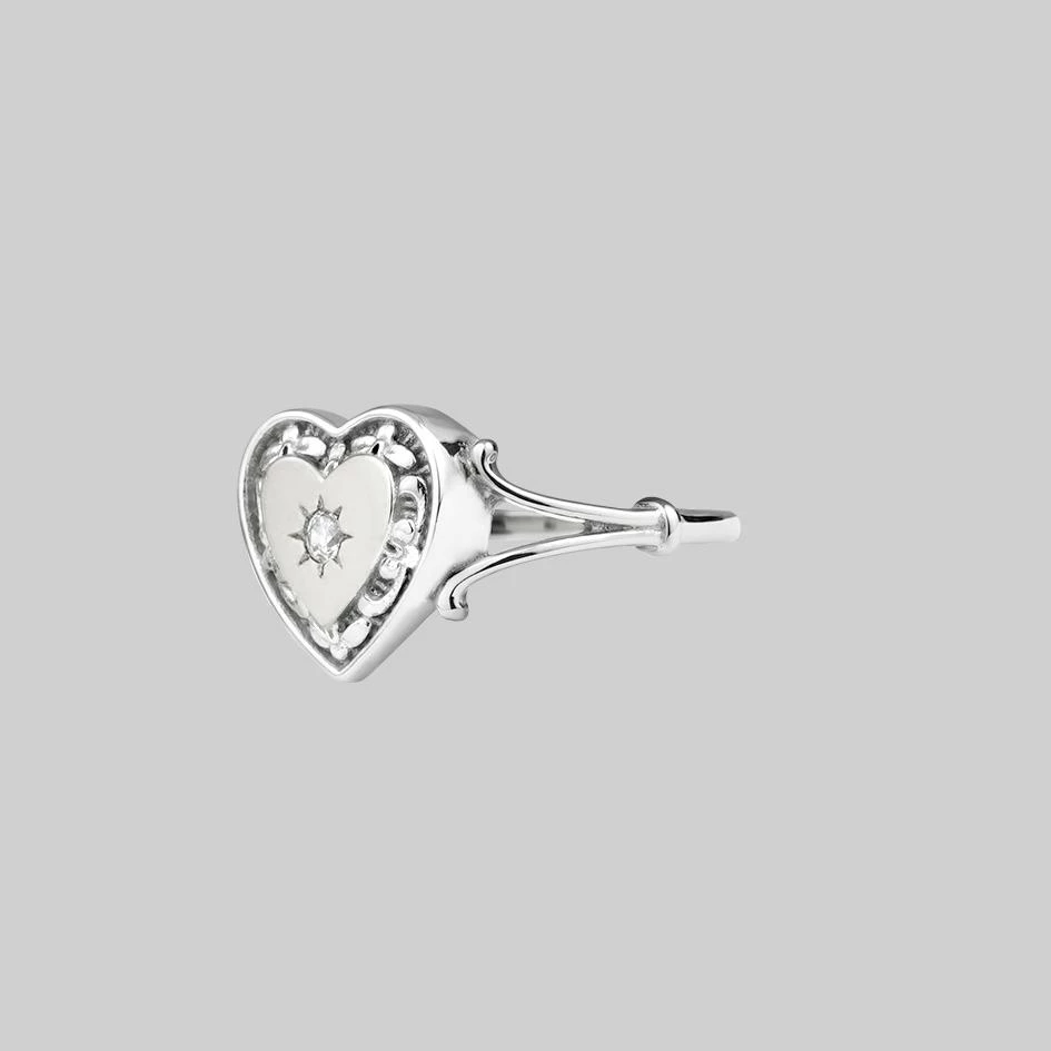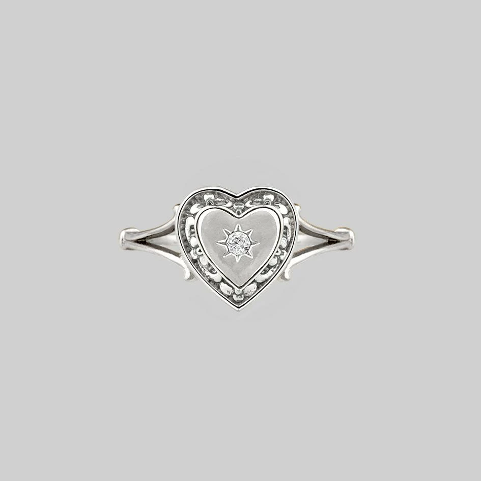 Romantic heart with border detail featuring a starburst set tiny Cubic Zirconia crystal sits between ornate shoulders.