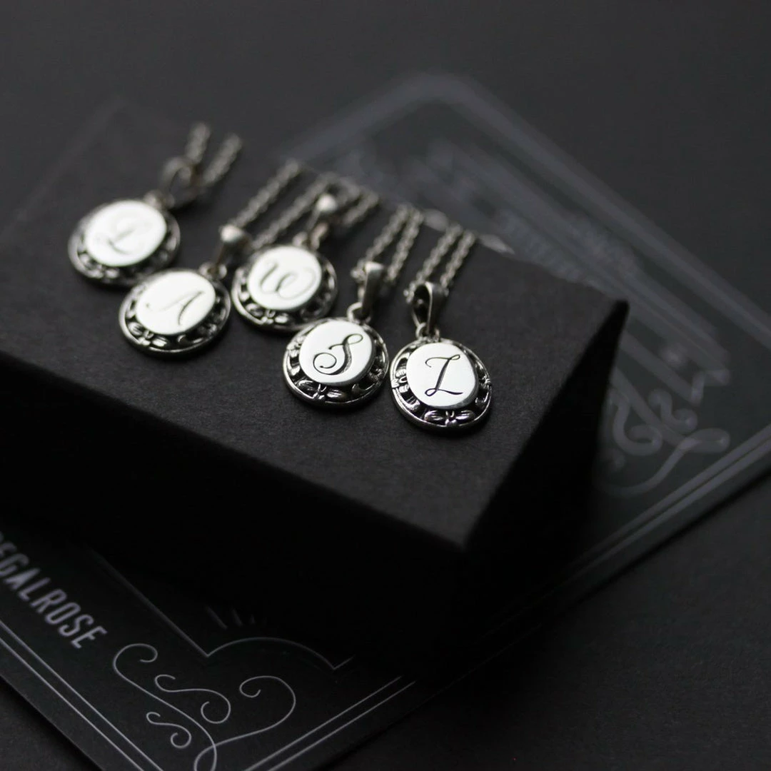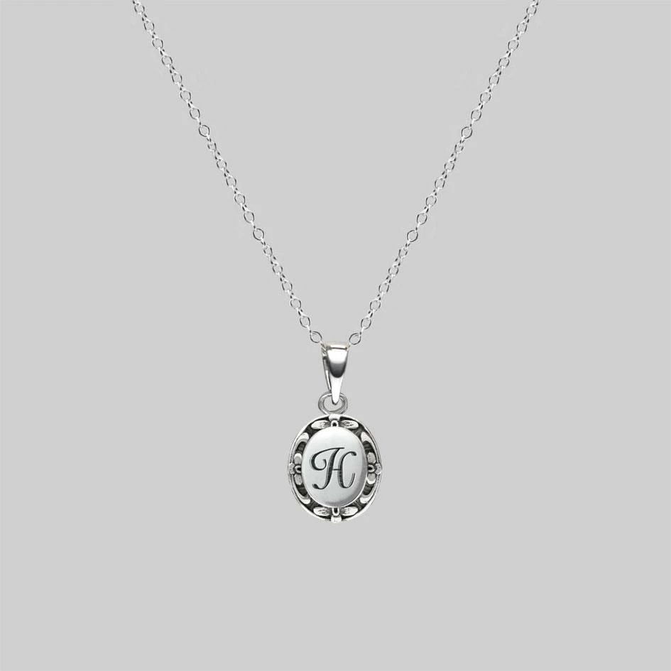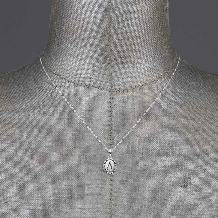 Silver medallion necklace featuring a delicate script initial with ornate frame.