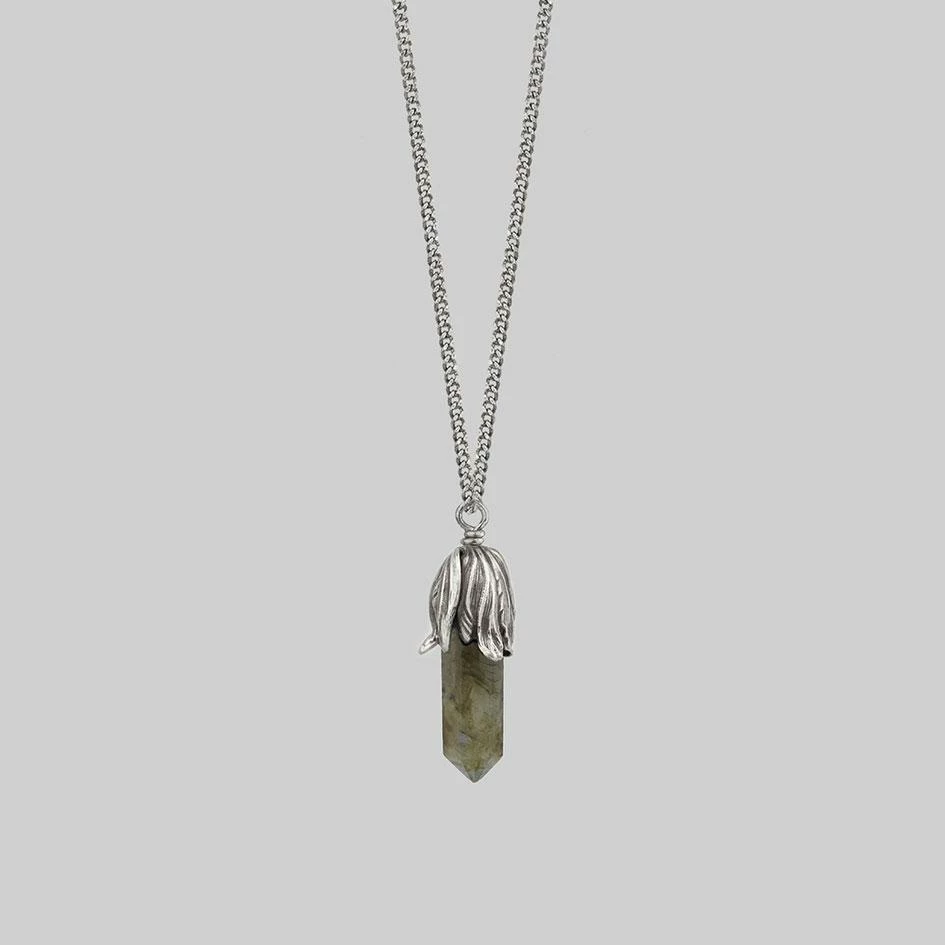 Labradorite gemstone shard encased within flourishing wild petals, hangs on a short adjustable chain.