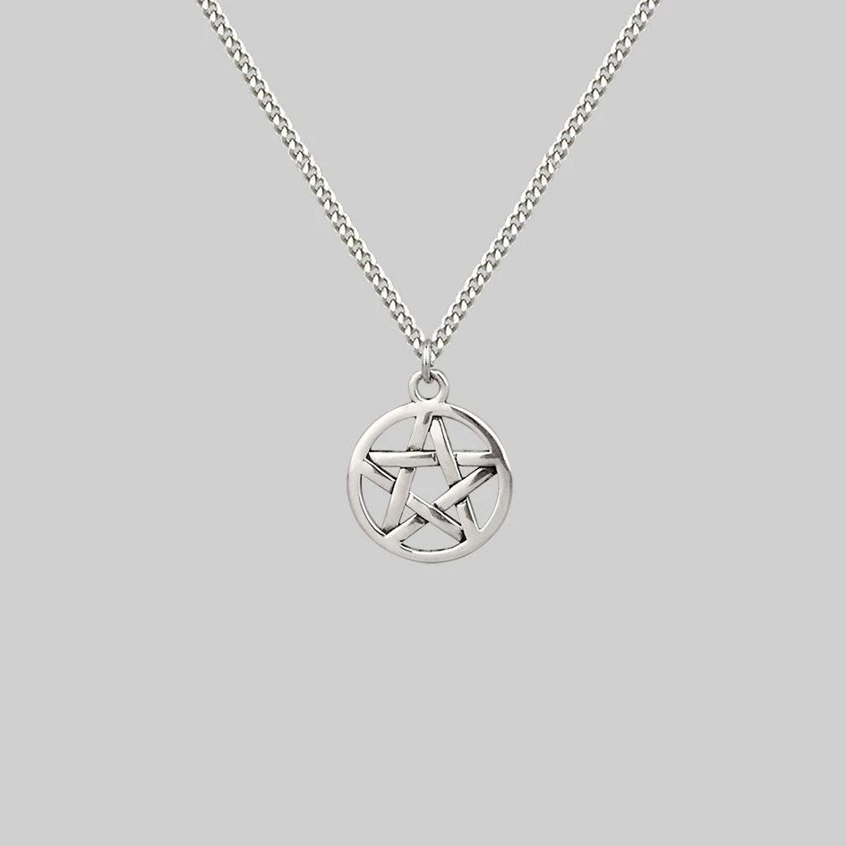 Silver Pentagram symbol necklace. The pendant hangs from a thin, delicate curb chain.