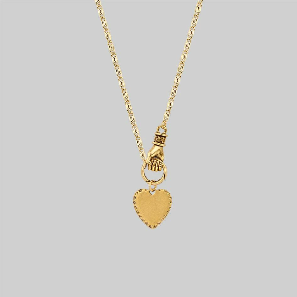 Layering necklace featuring a hand grasping heart pendant.