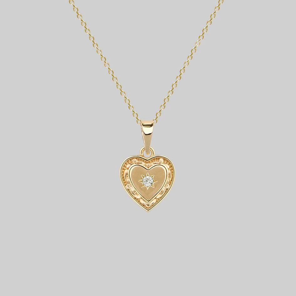 Romantic heart necklace featuring a starburst set tiny Cubic Zirconia crystal center.