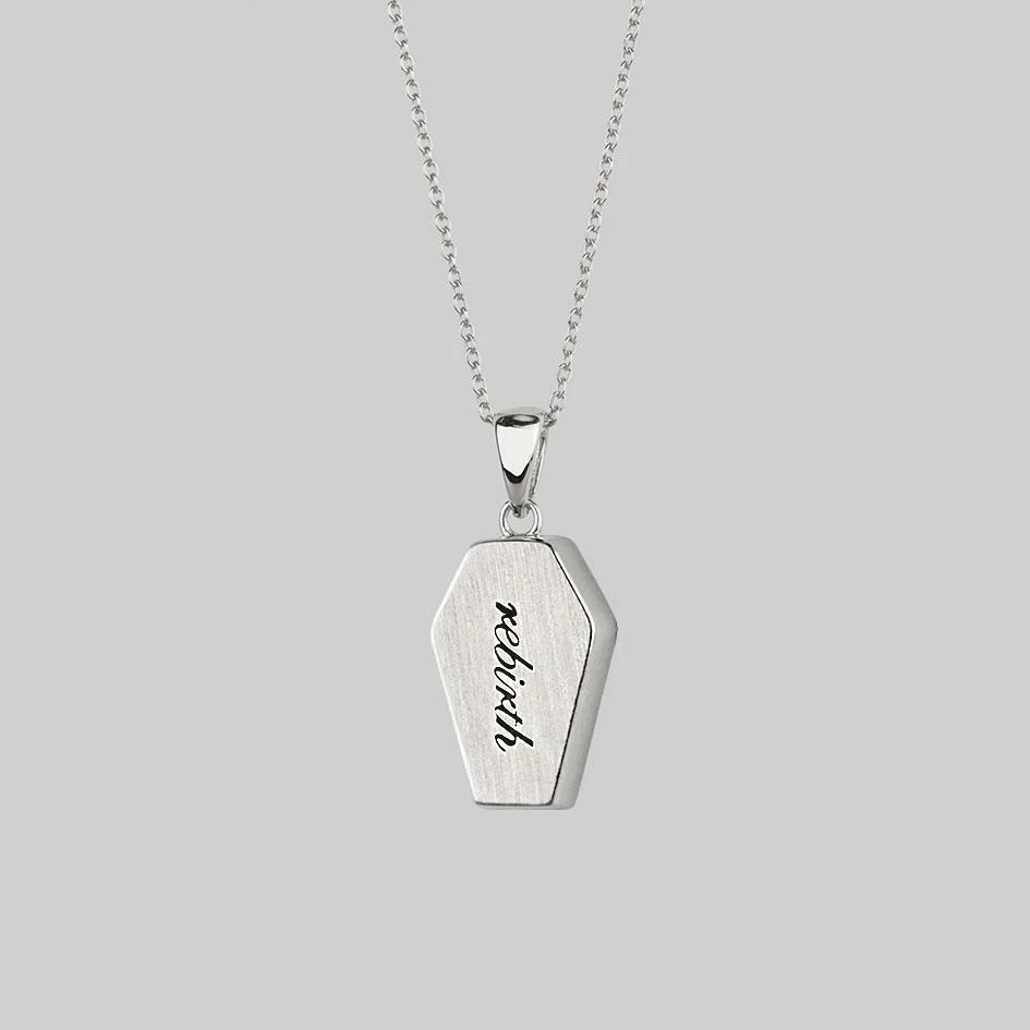 The word ‘rebirth’ is inscribed on the back of the coffin.