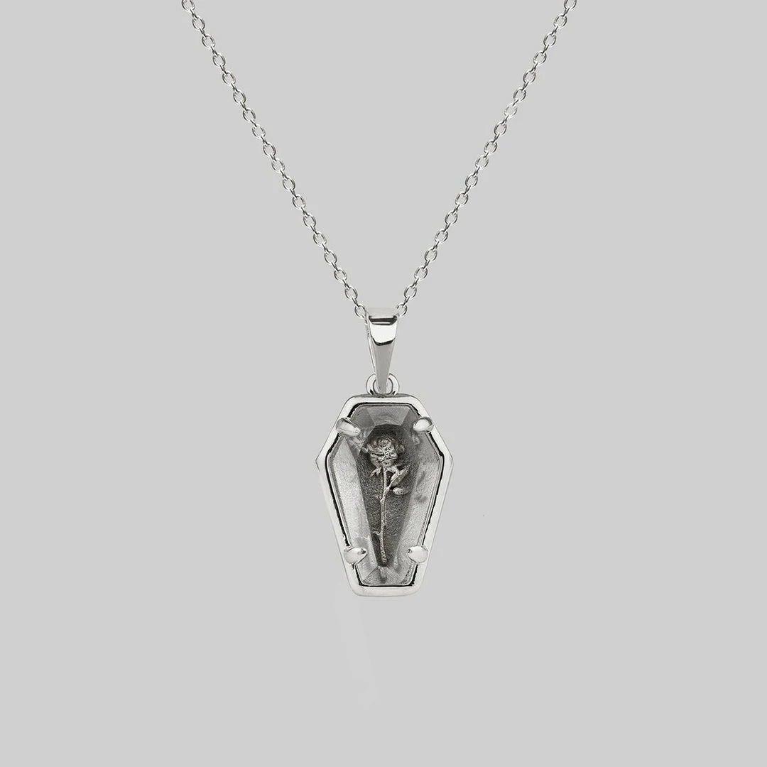 3D Rose under glass coffin necklace. A delicately detailed single rose lies framed under faceted Cubic Zirconia. A single black rose symbolises death and renewal.