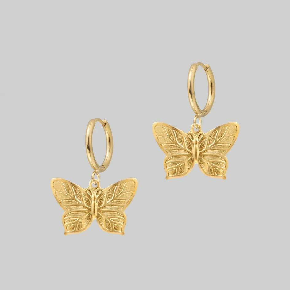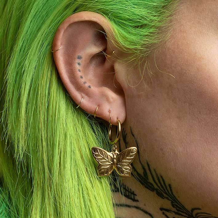 Gold butterfly hoop earrings.